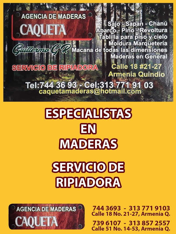 AGENCIA DE MADERAS CAQUETA: Somos Especialistas en Maderas. Disponemos de la Mejor Calidad y Variedad en Madera Sajo, Sapan, Cedro, Chanú, Abarco, Pino, Revoltura, Tablilla para Piso y Cielo, Moldura para Marquetería, Macana en todas las dimensiones y Maderas en General. Contamos con 2 Puntos de Atención al Público: Calle 18 No. 21-27 y Calle 51 No. 14-63. Ventas al por Mayor y Detal. Servicio de Ripiadora. Despachos a Nivel Nacional. Horarios de Atención de Lunes a Sábado de 07:00 A.M a 05:00 P.M Jornada Continua. VEN Y ENCUENTRA LO QUE NECESITAS EN MADERA.