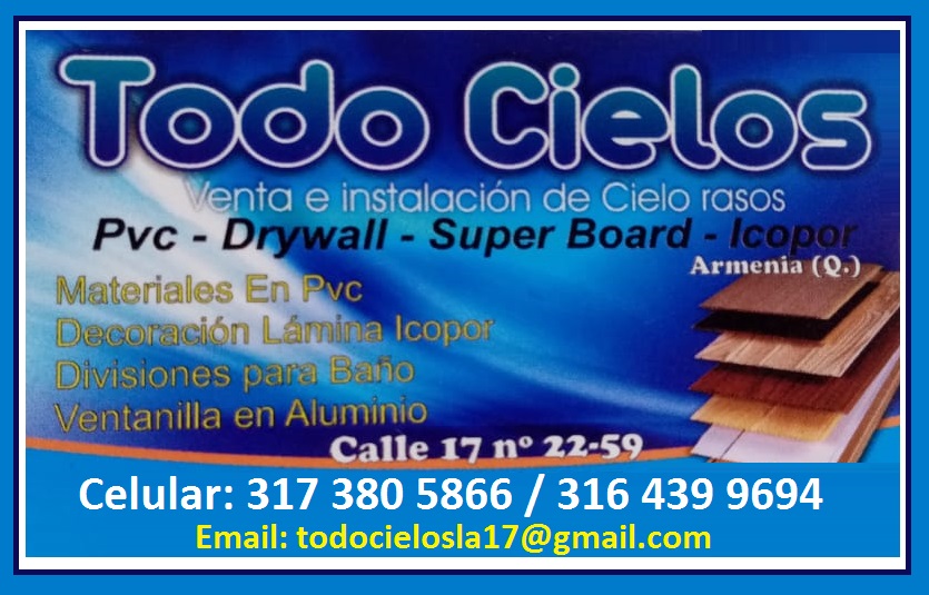Somos una Empresa moderna y con un alto sentido social y líderes en el Quindío. Para los clientes que buscan los mejores PROFESIONALES, les ofrecemos, Cielo Rasos, Aluminio Arquitectónico, Ventanas, Puertas, Cocinas Integrales, Divisiones para Baño, Icopor, PVC, Drywall, Super Board. Prestamos un servicio inmediato garantizando la exactitud y la calidad de nuestro trabajo.